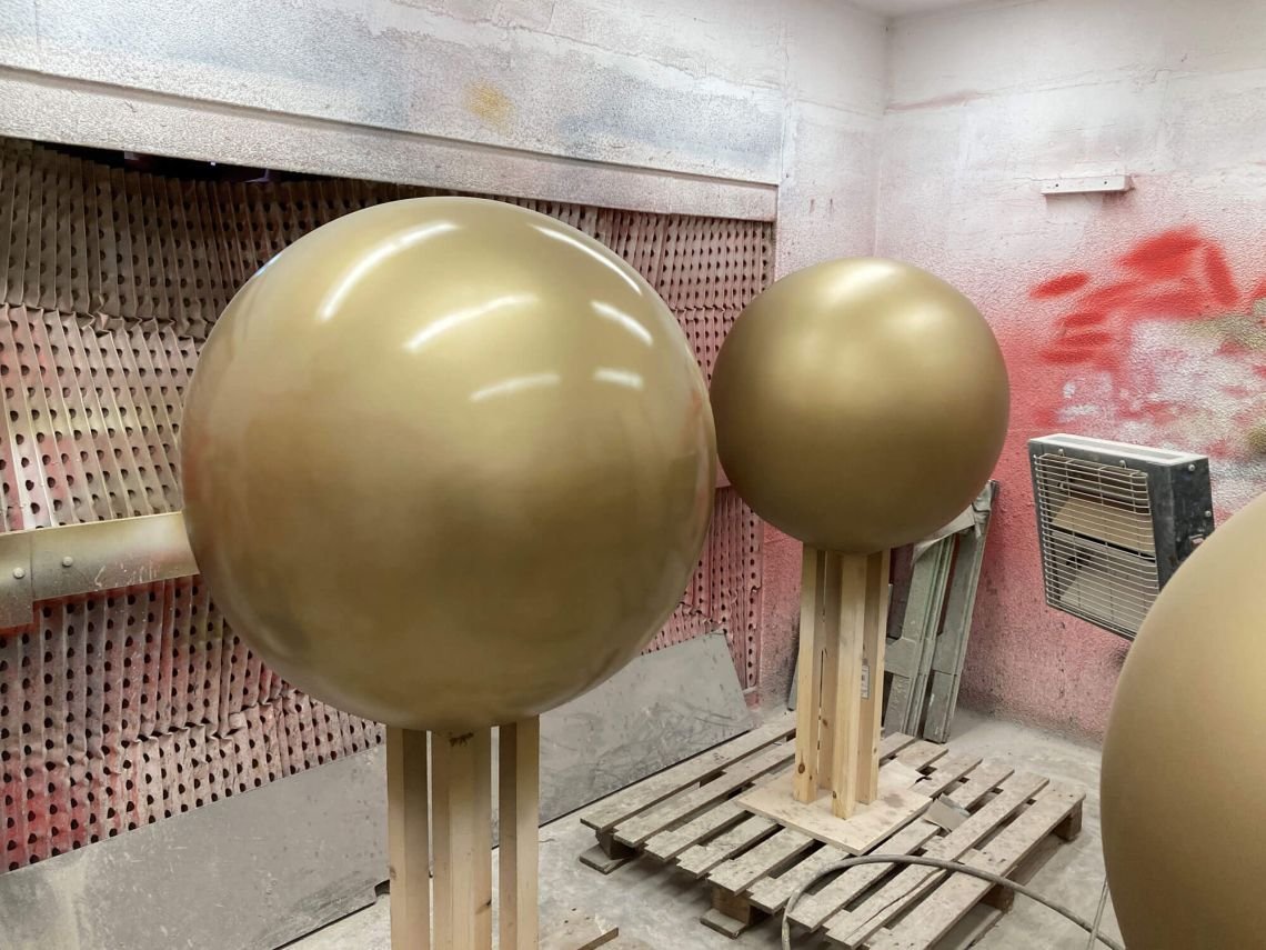 Each sphere was fibreglass moulded, sanded, and polished to perfection before being painted in gold and finished with a high-gloss lacquer. A few weeks before installation, the plan changed: Somerset House requested that the props not be fixed directly to the floor. Working with our composite engineer, we quickly developed circular bases to anchor each sphere safely. (Demonstrating how important flexibility and modular design are when dealing with evolving event logistics.)